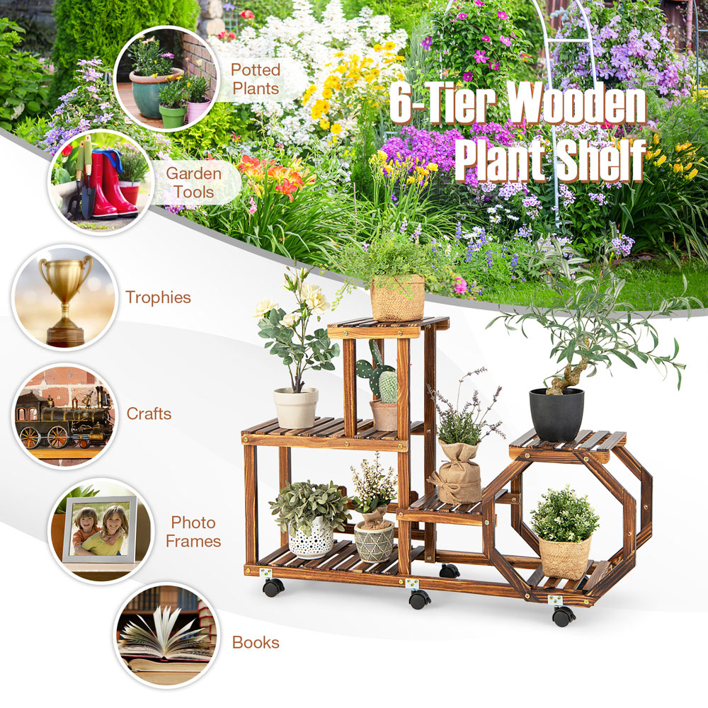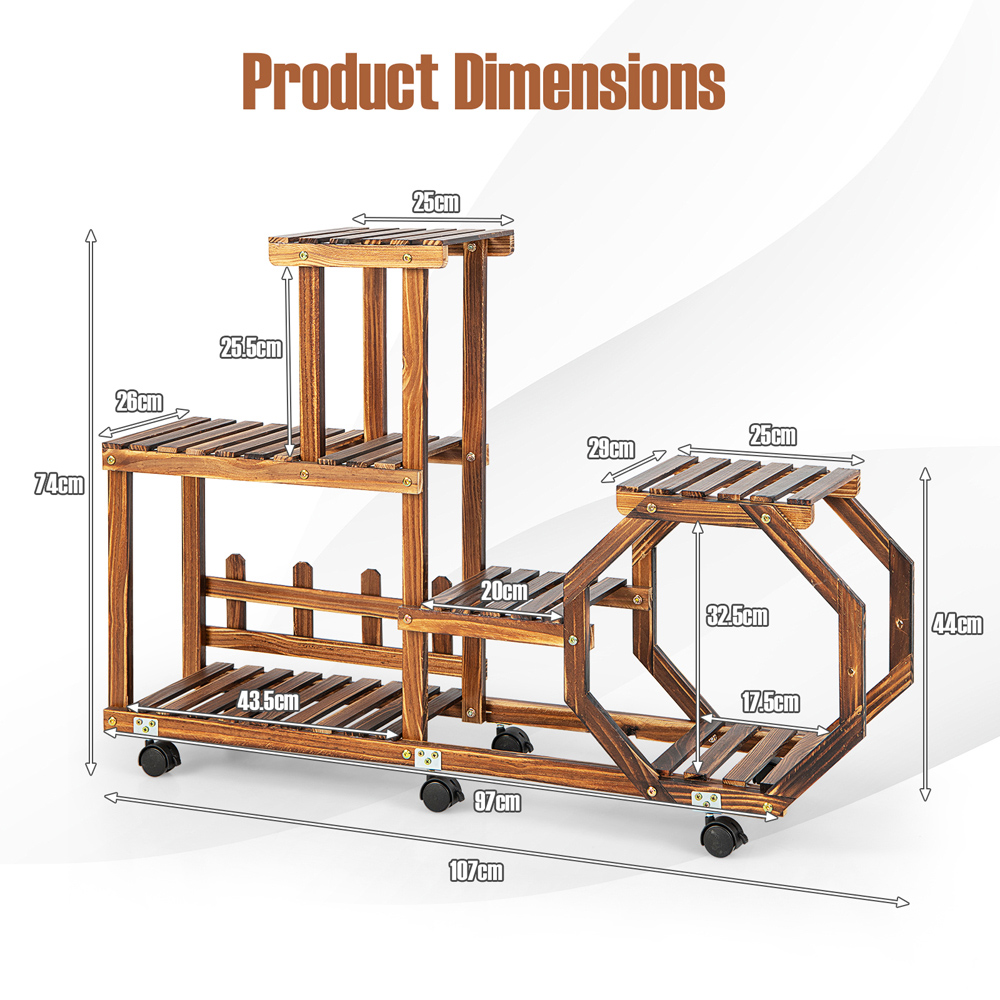 Showcase your green thumb and decorative flair with the Costway 4 Tier Wooden Rolling Plant Stand. This versatile stand not only nurtures your plants with its high-low structure to ensure unobstructed sunlight but also serves as a charming display for your cherished ornaments and collectables. Crafted from 100% natural pine wood, treated with high-temperature carbonisation for durability and featuring detachable, 360° swivelling wheels, this plant stand is a perfect addition to any indoor or outdoor space. Its multipurpose design and humanised features like hollowed panels for better air circulation make it essential for plant lovers and decorators alike.