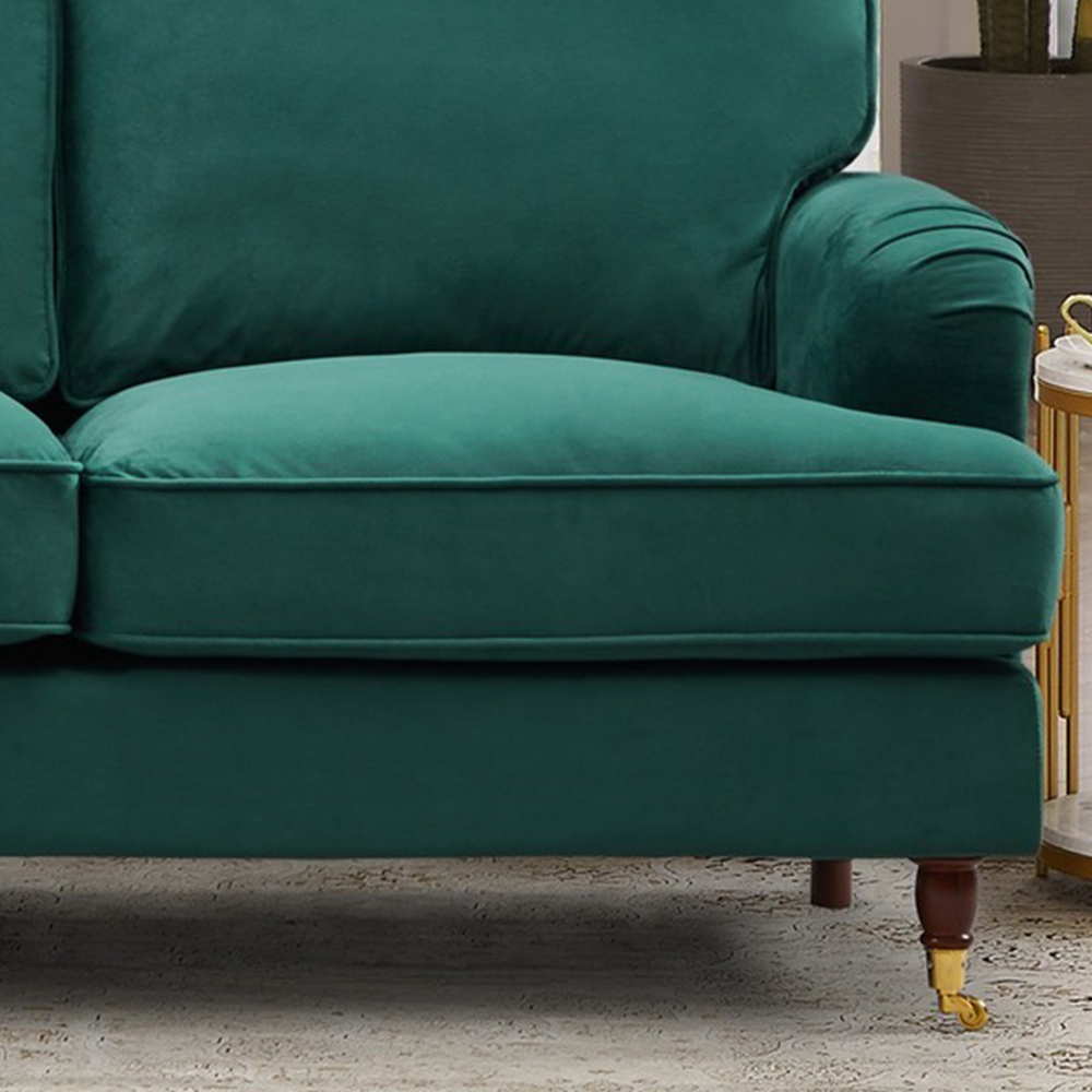 Make a striking addition to your bedroom with an elegant and spacious Woodbury 3 Seater Green Velvet Sofa. It features a hard wooden frame combined with a pocket-sprung interior filled with foam to offer you a perfect blend of balance between comfort and support. The three-seater sofa is upholstered in soft and luxurious green velvet, which is beautifully complimented by the dark wooden legs. The front legs of the sofa are tipped with a brass-coloured wheel to allow easy movement. Plus, your order will be delivered to your room of choice and assembled by the delivery team so you can relax and unwind on this sofa in no time.