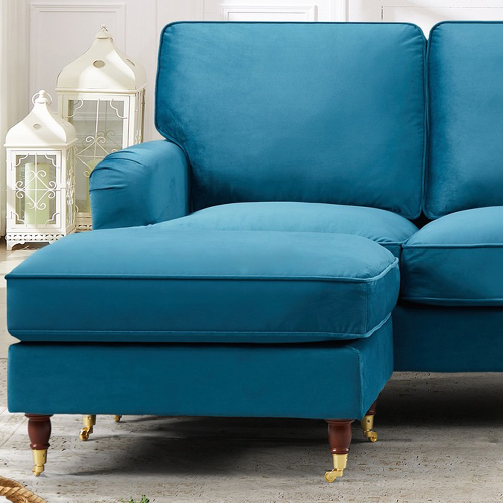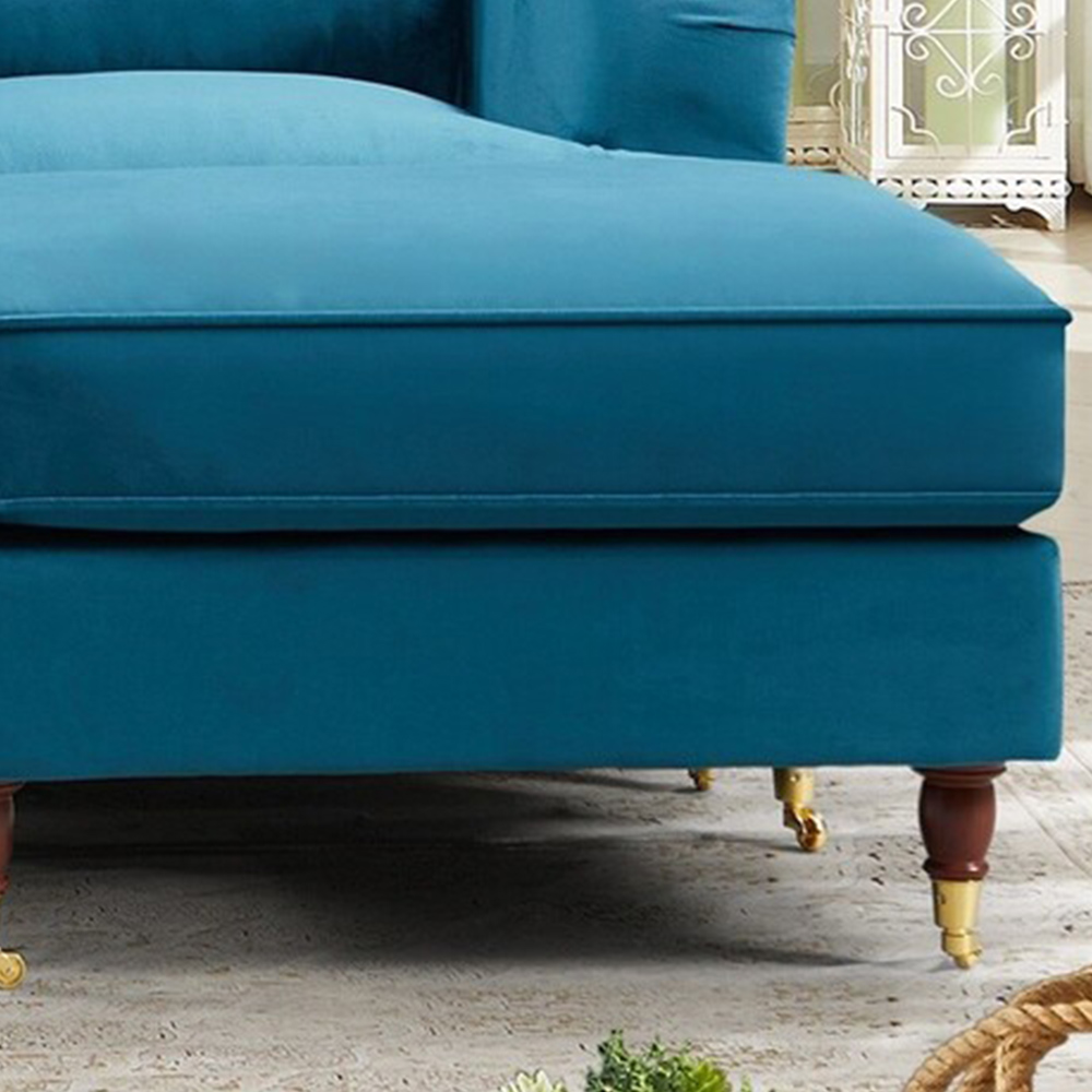 Brighten up your living space effortlessly with this elegant and spacious Woodbury 3 Seater Teal Velvet Reversible Corner Sofa. Sturdy and comfy, this sofa features a hard wooden frame combined with a pocket-sprung and foam-filled interior to offer you a blend of comfort and support. Its soft and luxurious teal velvet upholstery is complimented by dark wooden legs, adding a touch of charm to this sofa. The front legs of the sofa are tipped with a brass-coloured wheel offering easy movement. This gorgeous three-seater sofa comes with a detached ottoman, which can be placed anywhere along the sofa to create a reversible chaise. Plus, your order will be delivered to your room of choice and assembled by the delivery team so you can relax and enjoy this comfy and stylish sofa.