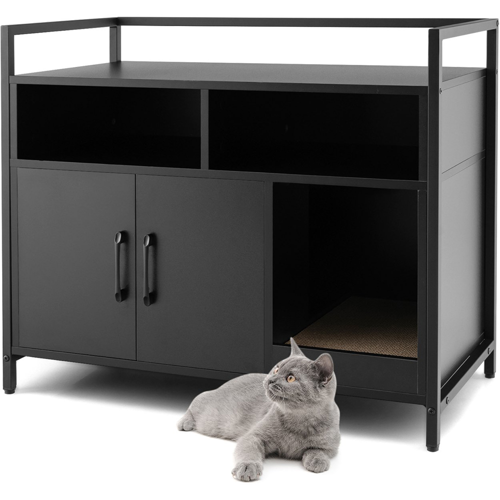 Create a convenient relieving spot for your pet cat with the Costway Black Wooden Cat Litter Box Enclosure with Scratching Board. It is crafted using a sturdy wood and rust-proof painted metal frame for durability and longevity. It has an industrial-style design with a weight capacity of up to 90kg for your convenience. The double-door cabinet provides privacy for the cat and is the ideal place to hide the litter box. It features an inner entry to provide easier access to the next shelf. There are three large holes in the back panel to facilitate air circulation and prevent odours. This cat litter box features guardrails with decent storage space for keeping your essentials. The two compartments and cabinets are suitable for keeping your favourite magazines, pet litter box or other pet supplies. The litter box enclosure is equipped with a thick and abrasion-resistant removable scratching board. It features adjustable feet with an anti-tip device to prevent tilting and tipping while providing stable support.