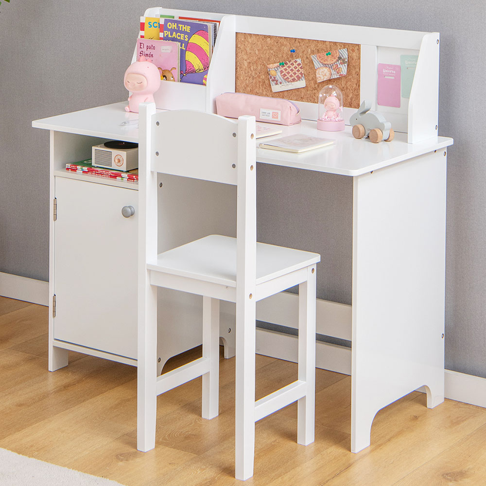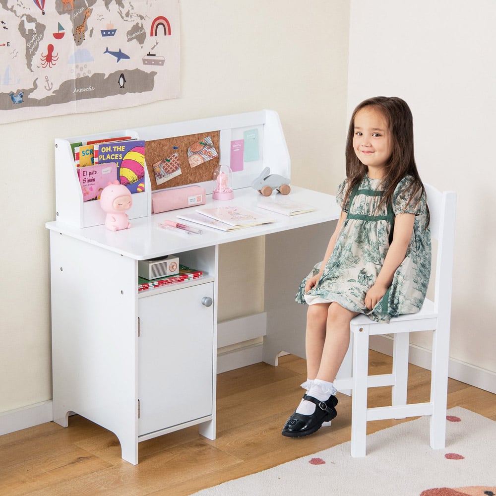 Boost your child's study time with the Costway Kids White Table and Chair Set with Storage and Bulletin Board. This set includes an ergonomic chair that supports a healthy posture, encouraging good sitting habits from a young age. The spacious tabletop gives ample room for writing, drawing, or playing while the integrated bulletin board acts as a handy reminder for important notes and schedules. Storage is no issue with the cleverly designed cabinet and open compartments that keep study supplies and toys neatly organised. Crafted from high-quality materials with child-safe finishes, this study set is a durable choice for any child's room. It's also easy to assemble and maintain, ensuring it remains a practical addition to your home or school for years to come.