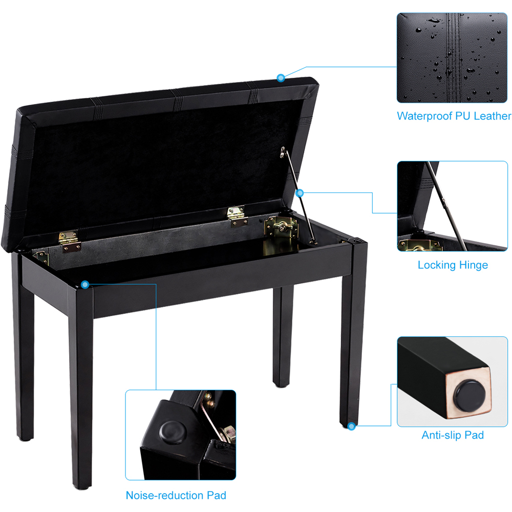 Elevate your musical experience with the stylish Costway Black Wooden Piano Bench with Storage. This bench comfortably accommodates two adults, making it perfect for duet performances or piano tutoring. Constructed from solid wood and covered with soft PU leather, it ensures durability and comfort during long practice sessions. The seat is padded with high-resilience sponge for ultimate comfort, and it features a large built-in storage compartment under the seat for your sheet music and books. Anti-slip foot pads protect your floors from scratches, making this bench a practical addition to any musical setting.