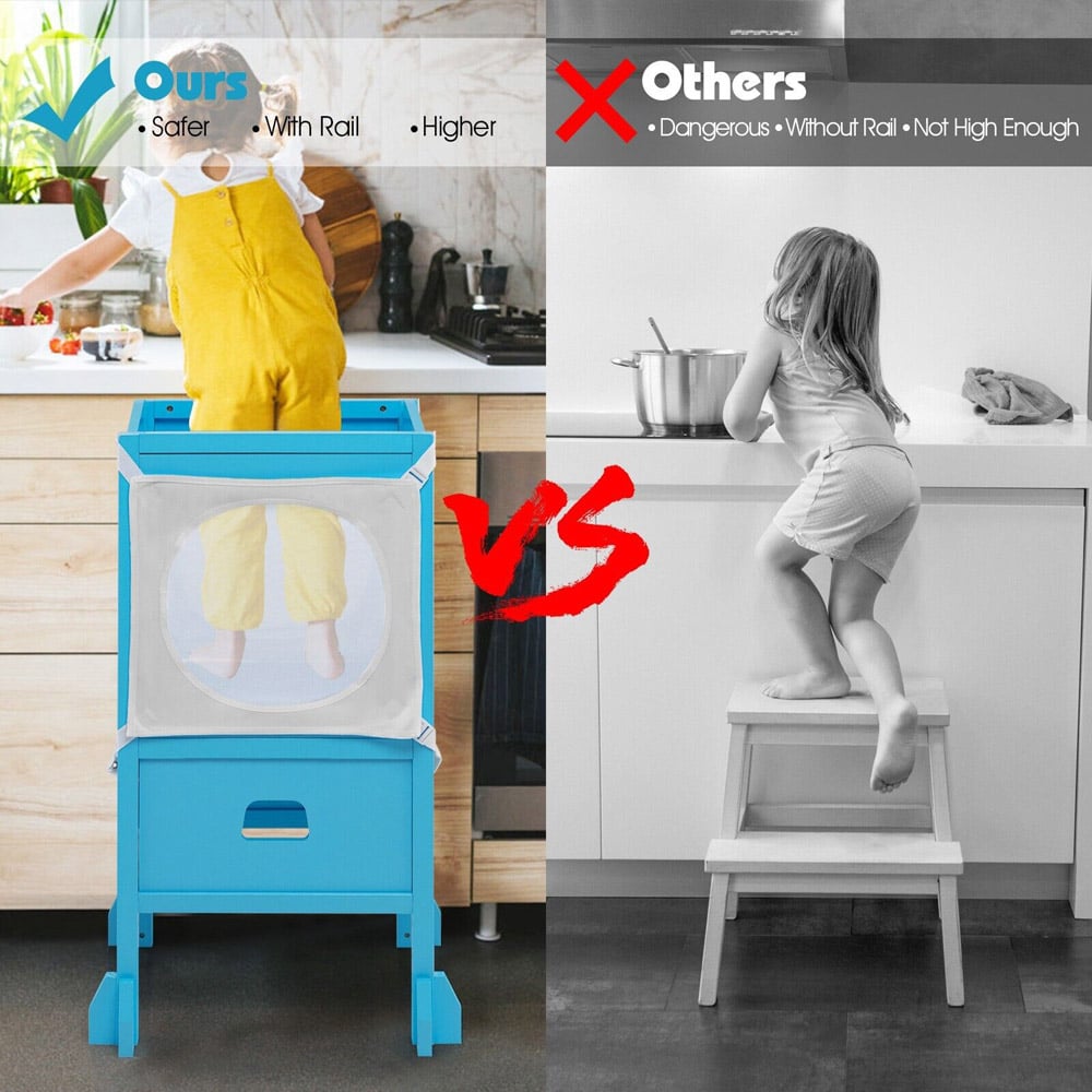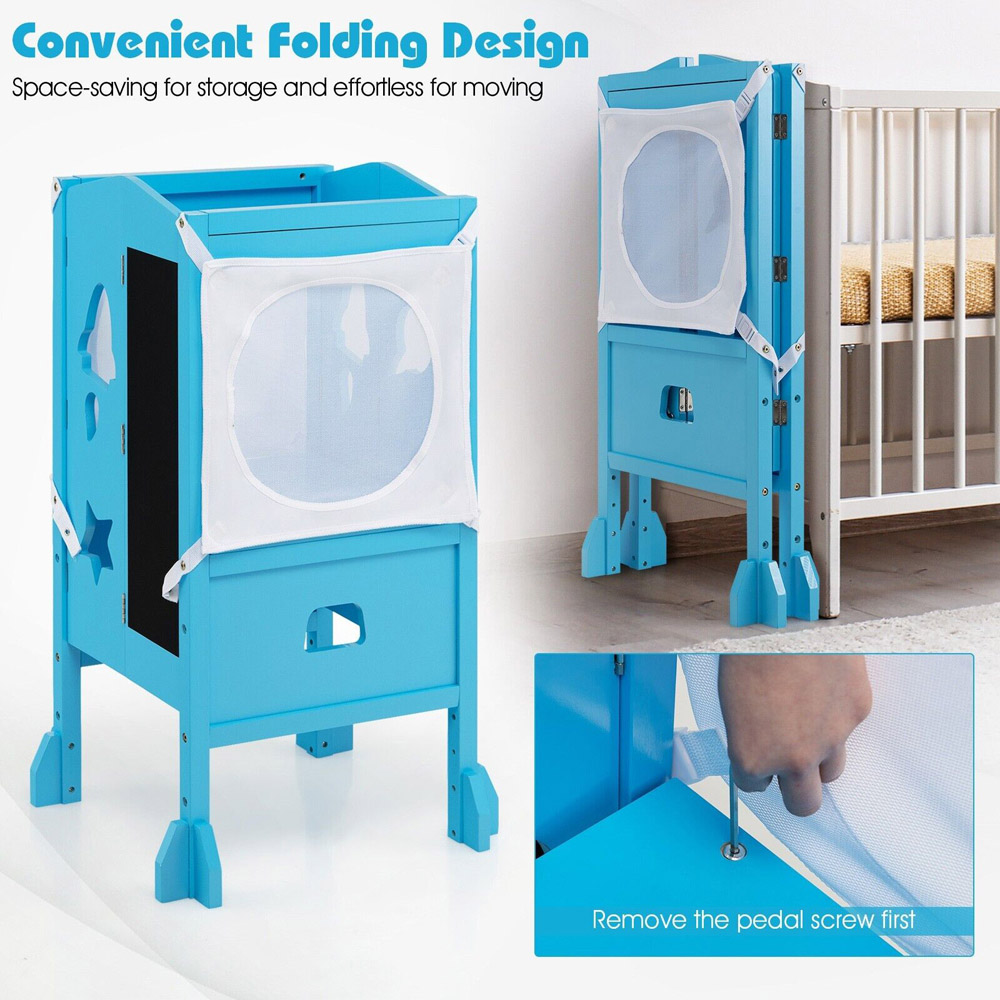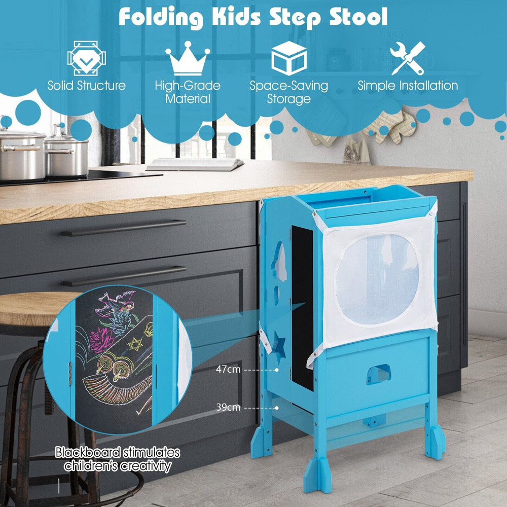 Enhance your little one's independence and safety with the Costway Kids Blue Kitchen Step Stool with Blackboard. This foldable step stool is perfect for children who are stable on their feet, featuring adjustable heights of 39 cm and 47 cm to grow alongside your child. The design includes a blackboard for creative expression and four-sided safety rails with additional safety nettings for utmost protection. Its sturdy construction and high stability ensure your child can participate in household activities safely and comfortably. When not in use, it folds compactly for easy storage, making it an excellent addition to any family home.