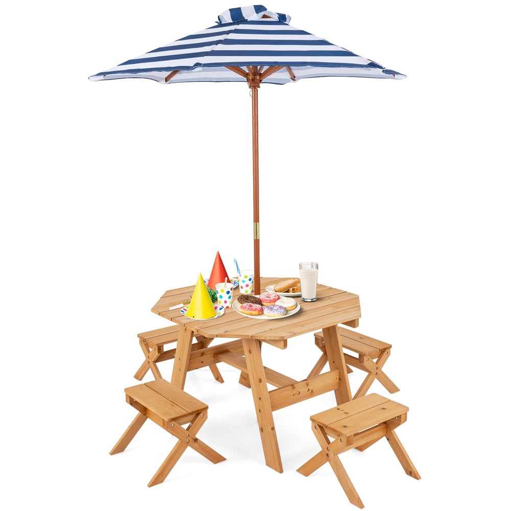 Create memorable moments with Costway 4 Seater Kids Picnic Dining Set with Adjustable Umbrella Natural. Complete with a table, an umbrella and four chairs, this set offers ample space on the large octagonal tabletop for children to enjoy playtime, meals, or reading together. The adjustable umbrella, with a diameter range of 127/130cm, is crafted from wear-resistant polyester fabric, supported by a solid wood pole and six-rib structure to shield children from direct sunlight. Designed for versatility, the umbrella is easily removable for indoor use. Made from high-quality fir wood, this activity table set is sturdy and built to last, with each piece treated with water-based paint for resistance to wear, cracking, and fading. The table and each chair can support up to 100kg, ensuring a safe and reliable environment for children. Prioritising safety, the set has a splinter-free surface and rounded edges. It also meets BSEN standards for enhanced durability. Ideal for indoor and outdoor use, this versatile set provides endless fun for children over three years old, making it a thoughtful gift for special occasions such as Children's Day, birthdays, or Christmas.