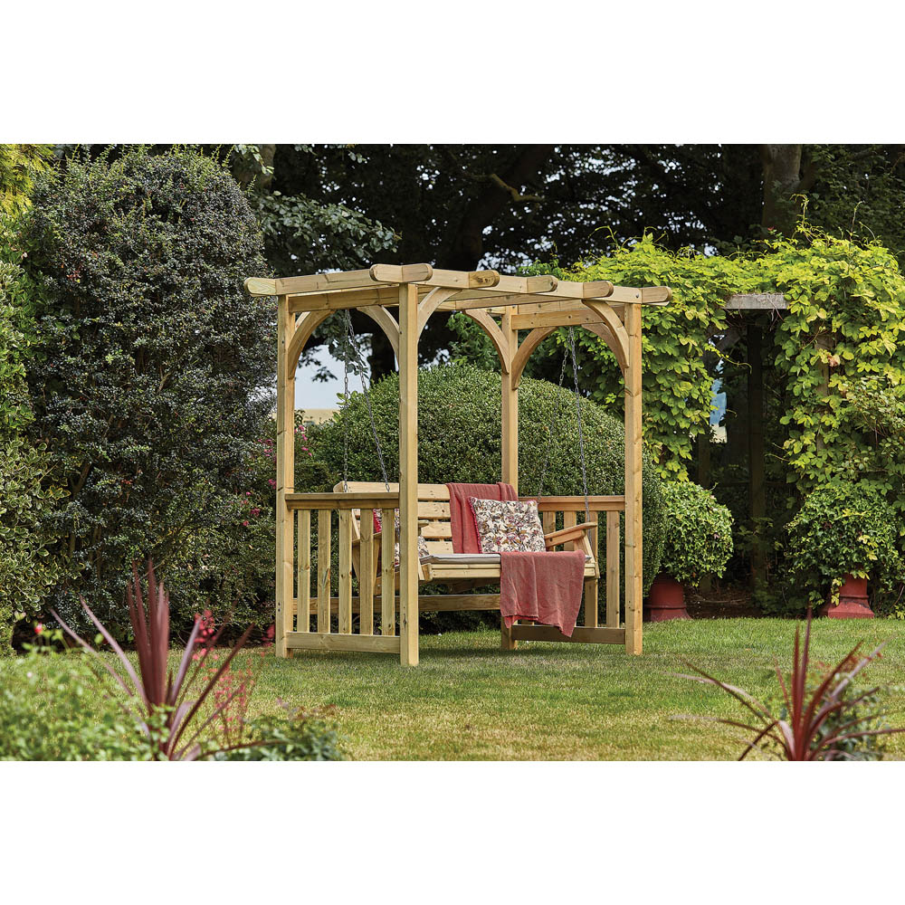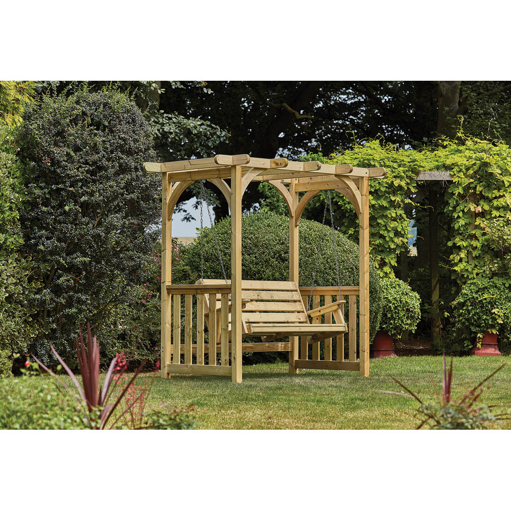 Great for your garden or large patio, this contemporary Appleton Swing Arbour will be a beautiful addition to your garden landscape. With a soft swinging motion that will instantly relax you after a hard day at work this swing seat is pressure-treated and can be used all year round. Finished to a high standard and with quality craftsmanship that's built to last. Whether you are looking for seating in a sun trap or just a spot to sit down and relax with family and friends, this bench comfortably seats two people and is designed for comfort. This garden seating is made of FSC-certified wood for long-lasting durability and comes with a 20-year anti-rot guarantee. This garden bench also has a self-assembly design for easy setup. This product is part of a larger collection that includes other great garden furniture pieces.