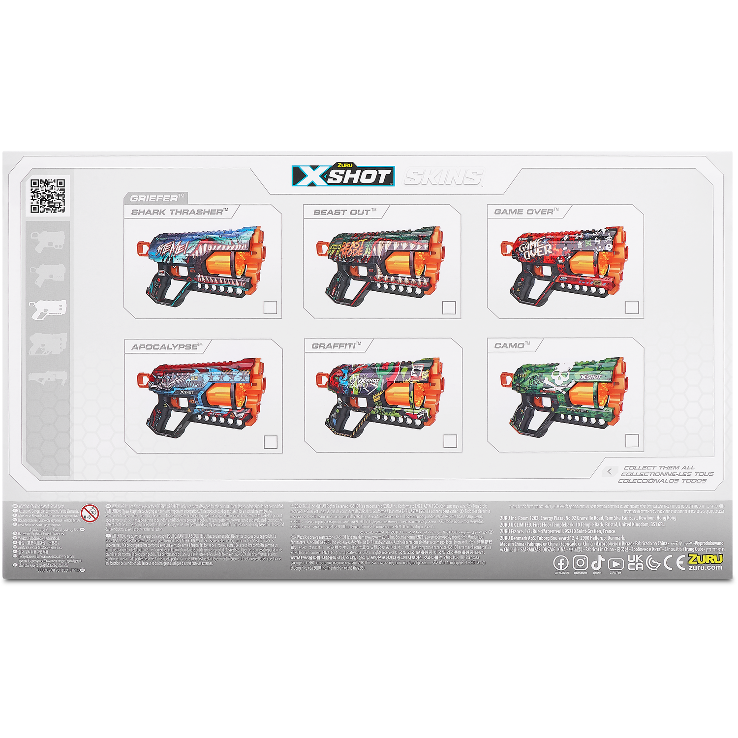 X-Shot Skins brings the in-game experience of skinning your blaster into the real world. Choose your Skin and join the battle. The X-Shot Skins Griefer packs enough power to take on targets 27m / 90 feet away! This blaster blows away the competition with a rapid-fire of 6 darts in under 30 seconds using the rotating barrel, plus extra dart storage below to keep you locked and loaded in battle. Use the easy pull-to-prime mechanism to strike the competition before they see you coming. The X-Shot Skins Griefer blaster comes with 6 unique skins to select and collect and 12 Air Pocket Technology foam darts.