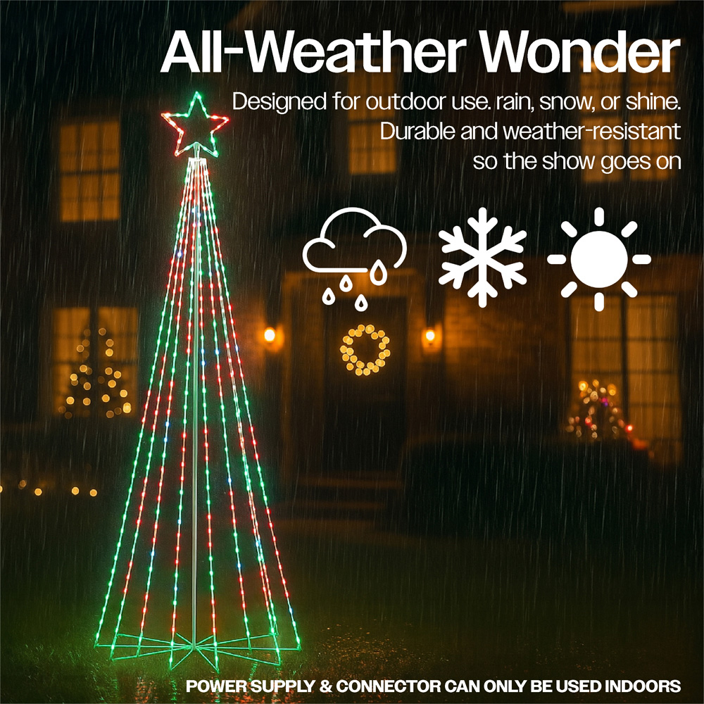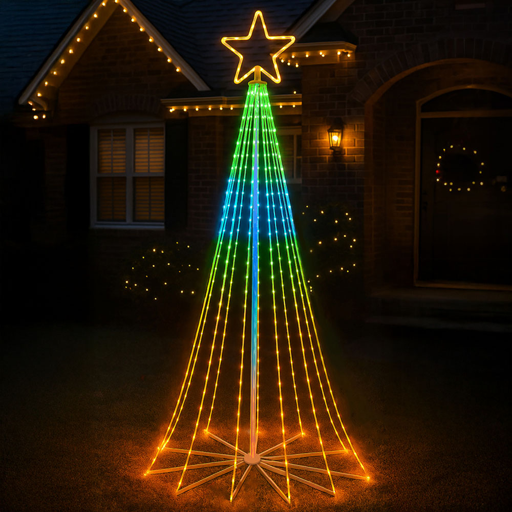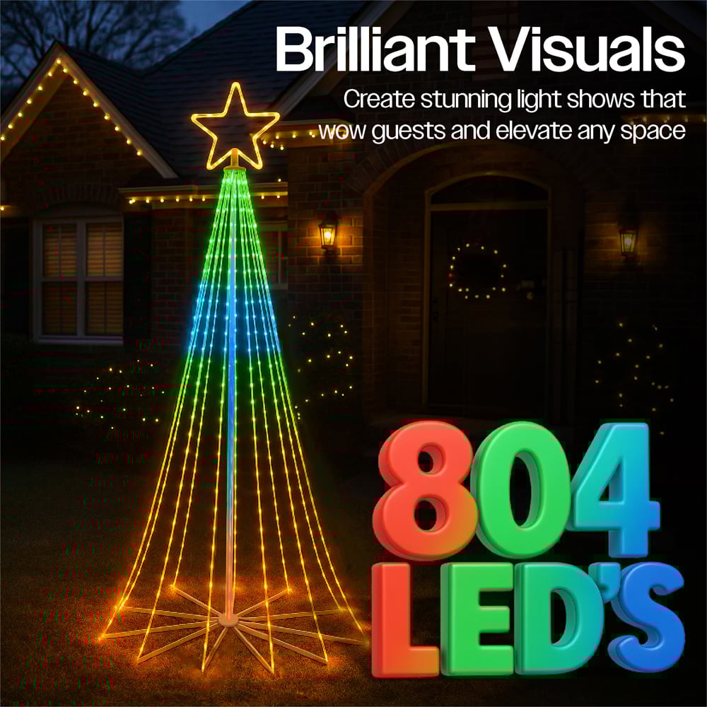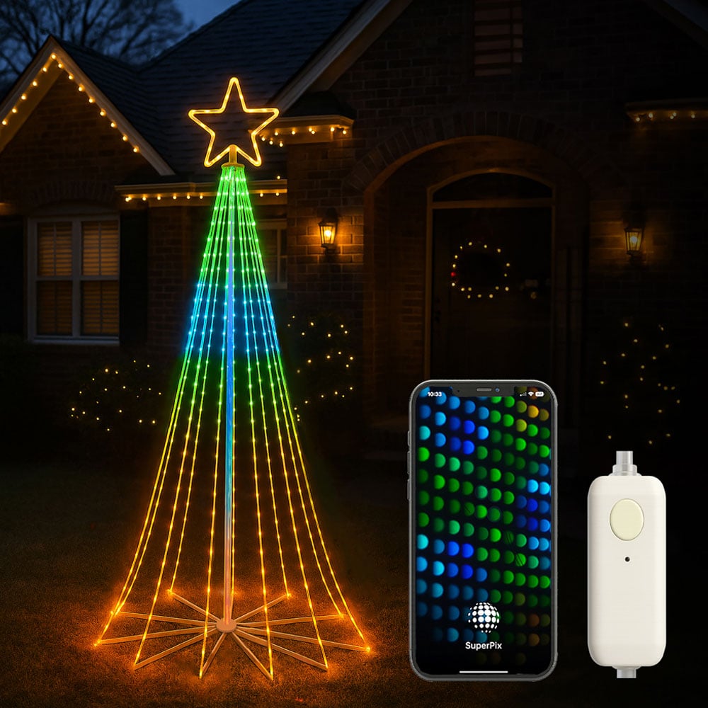 Light up your holidays with the Xmas Haus 2.4M Cone Tree Light, featuring 804 brilliant RGB Micro Seed LEDs across 18 cascading light strings, all crowned with a glowing star topper. This sleek, modern tree blends festive tradition with contemporary elegance, ideal for patios, gardens, or as a standout indoor display. Crafted with soft, flexible copper wire and a sturdy metal base, it's designed for both indoor and outdoor use. Customise your tree with ease using the Super Pix app, giving you full creative control over brightness, colour, animation, and lighting effects, all from your smartphone. Whether you prefer a soft ambient glow or a dazzling light show, this cone tree brings your perfect holiday atmosphere to life in seconds. Comes complete with a safe BS IP20 transformer for peace of mind.