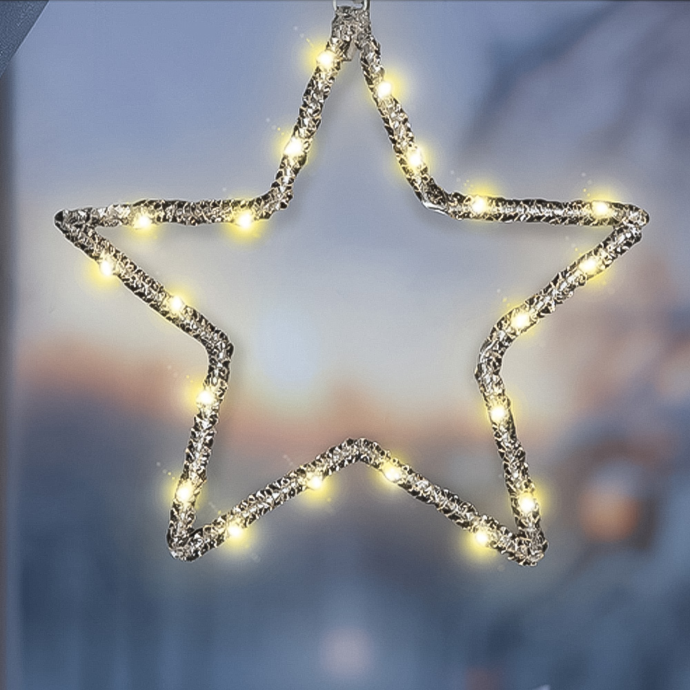 Illuminate your holiday season with the Xmas Haus LED Warm White Hanging Star. Featuring an intricate star design, this enchanting decoration is adorned with 20 delicate micro LEDs, casting a soft and inviting glow. With a generous 50cm lead and battery-operated timer function, decorating has never been easier. Hang them effortlessly indoors or outdoors on porches, brackets, ceilings, trees, bushes, or windows to infuse your space with festive charm. These elegant pieces are sure to add a touch of magic to your holiday decor.
