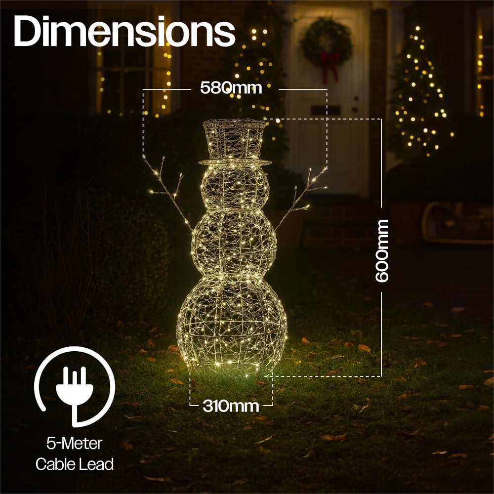 Bring festive cheer to your garden with a floor-mounted outdoor silver snowman LED Christmas decoration that shines with 330 warm white lights, creating a welcoming glow for all who visit. Standing at 60cm tall and crafted from silver metal wrapped in durable PVC strips, this large snowman garden ornament features a wire base for stability and a generous 5m lead for flexible placement. With its inviting illumination, it's perfect for adding a magical touch to any porch, doorway or festive outdoor display.