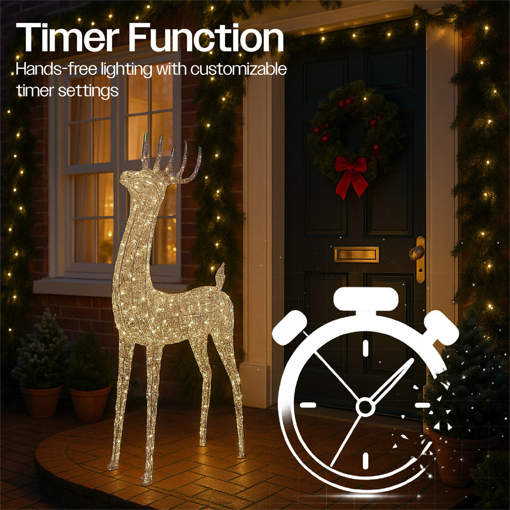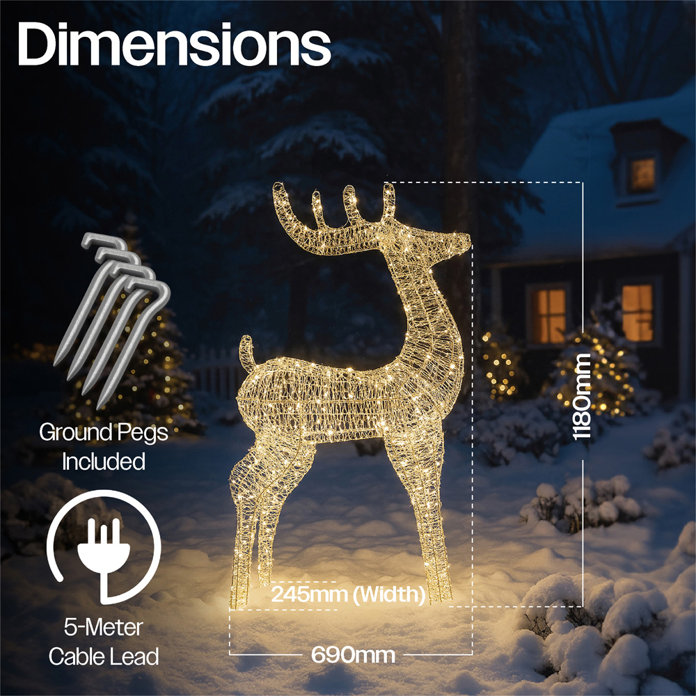 Turn your home into a winter wonderland as a shimmering silver deer brings a festive glow to your garden, patio or front yard, featuring 600 warm white micro LEDs wrapped around a durable metal frame with a sleek silver PVC finish. Designed to withstand UK weather, this eye-catching Christmas decoration offers long-lasting charm and comes with a 5m cable and a reliable BS IP20 transformer, making it easy to set up and enjoy throughout the season.