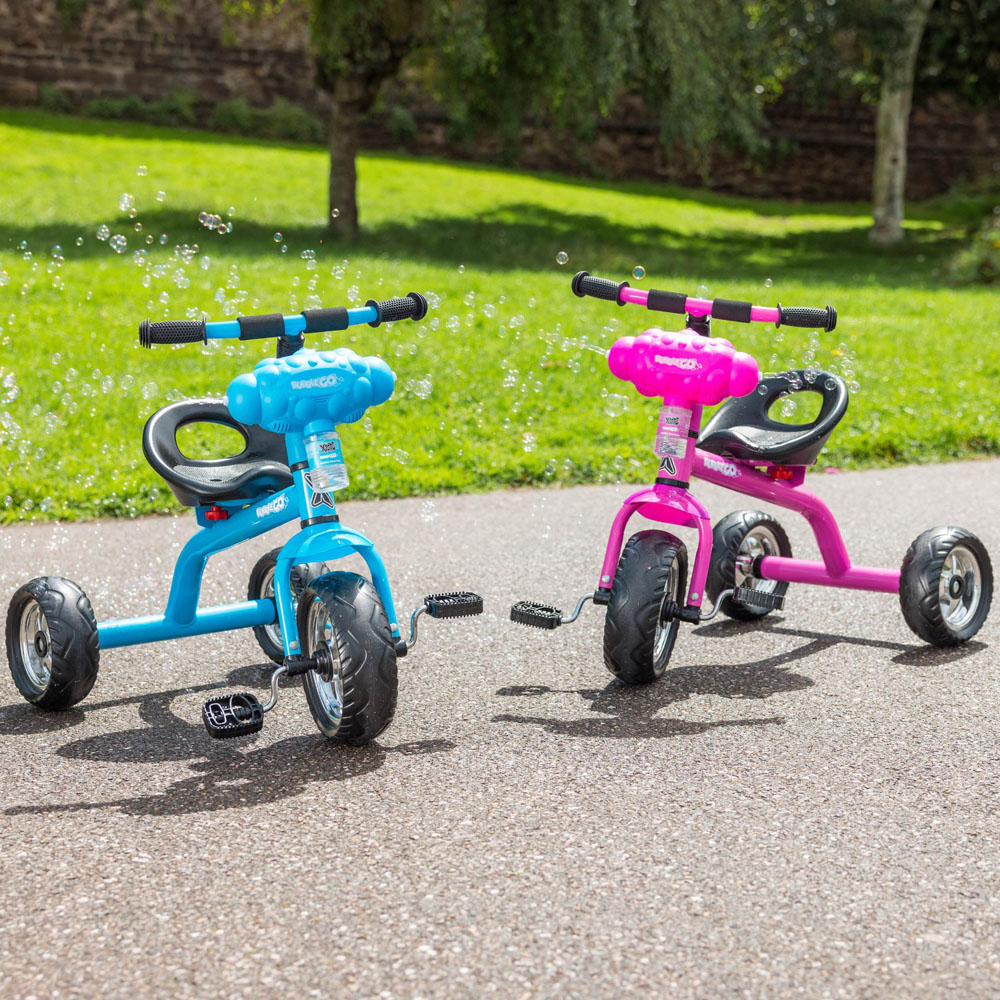 Experience ultimate fun with the Xootz Blue Bubble Go Trike. This is perfect for little ones who want to ride in style. Suitable for ages 3+, the Bubble Go trike provides low-impact exercise and hours of fun. With the addition of a front-mounted bubble machine, little ones can whizz around leaving a trail of bubbles behind them. With the easy clip assembly, this can be easily put together and ridden in a matter of minutes. The front-mounted bubble machine is easily attached below the handlebars and comes complete with 500ml of bubble solution which can be easily topped up when necessary. Watch little ones' faces light up as they cycle past leaving a trail of bubble fun behind them.