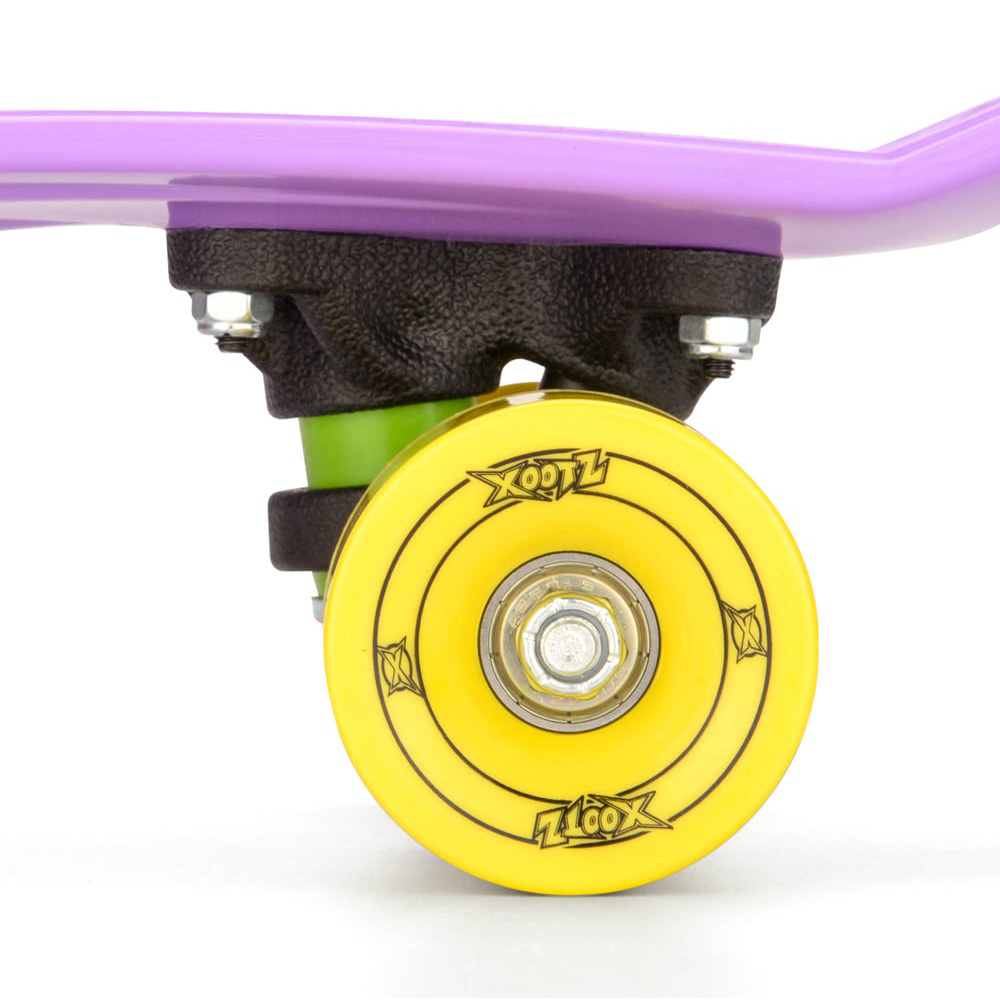 Let your child ride in style with the Xootz 22 inch Purple Kids Retro Plastic Cruiser Skateboard. It is the perfect choice for young riders eager to hit the streets on their board. Featuring a stable deck and carbon ABEC-5 bearings, this board offers a safe and smooth ride for kids looking to explore the world of skateboarding. With its single kick deck, riders can easily pop kerbs and perform tricks while cruising around the town. The retro design and fun pastel colours make this board a stylish choice for any young skater. Its compact size of 22 x 6 inches makes it easy to transport in a backpack, perfect for taking to school or a friend's house. Not only does it provide an exciting way for children to exercise, but it also helps improve balance, coordination, and confidence. Plus, with the stylish design and colour, your child can express their unique personality while cruising around the neighbourhood. So why wait? Get it today and watch as they discover the joy of outdoor play.