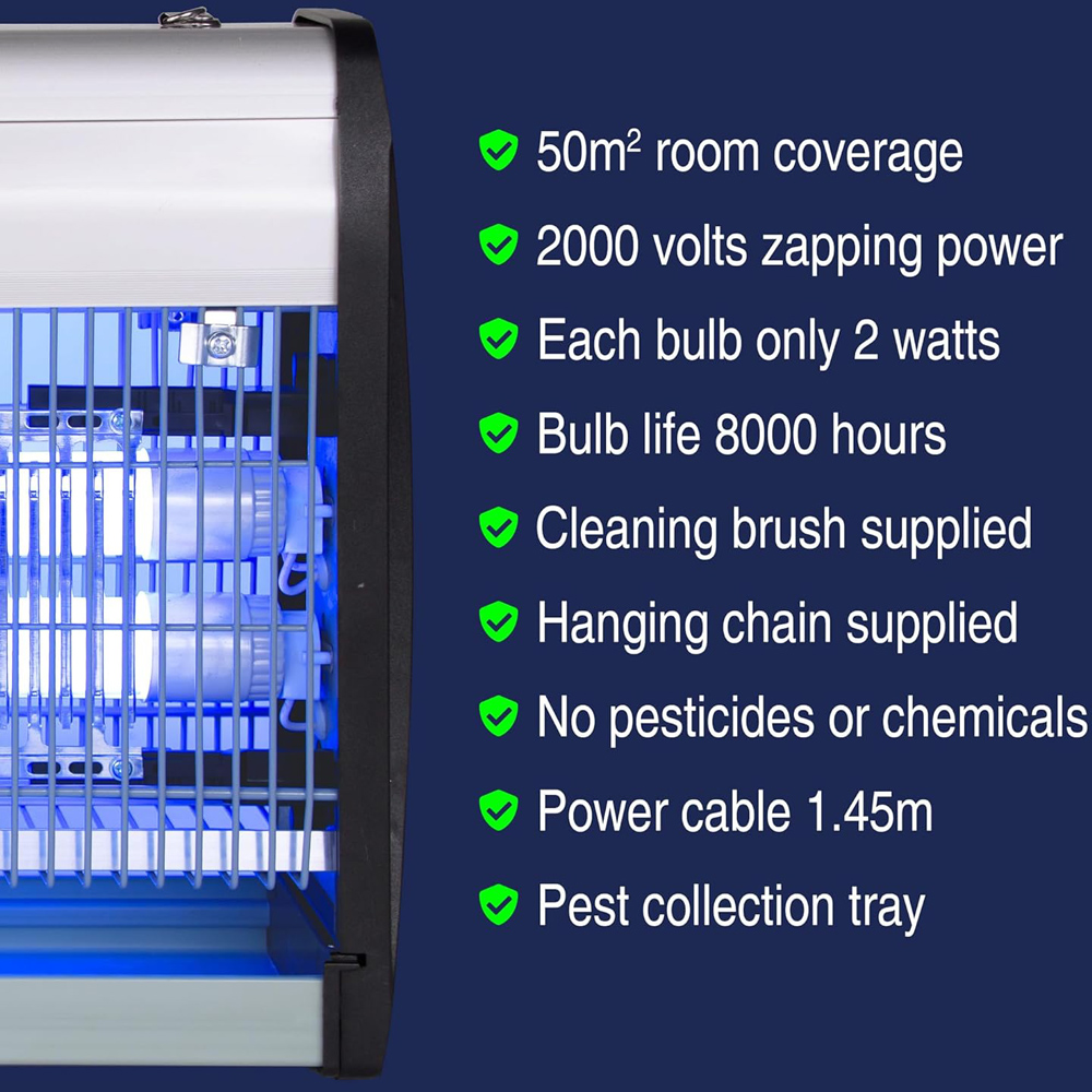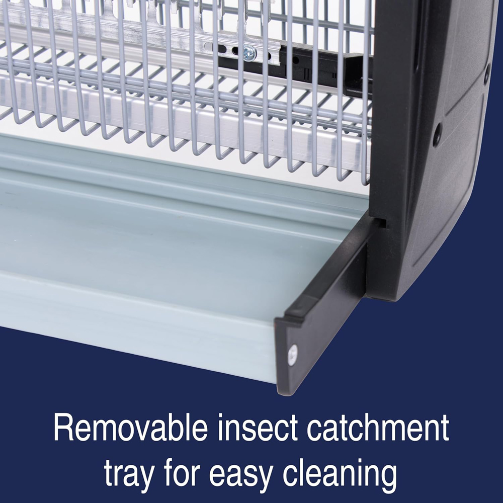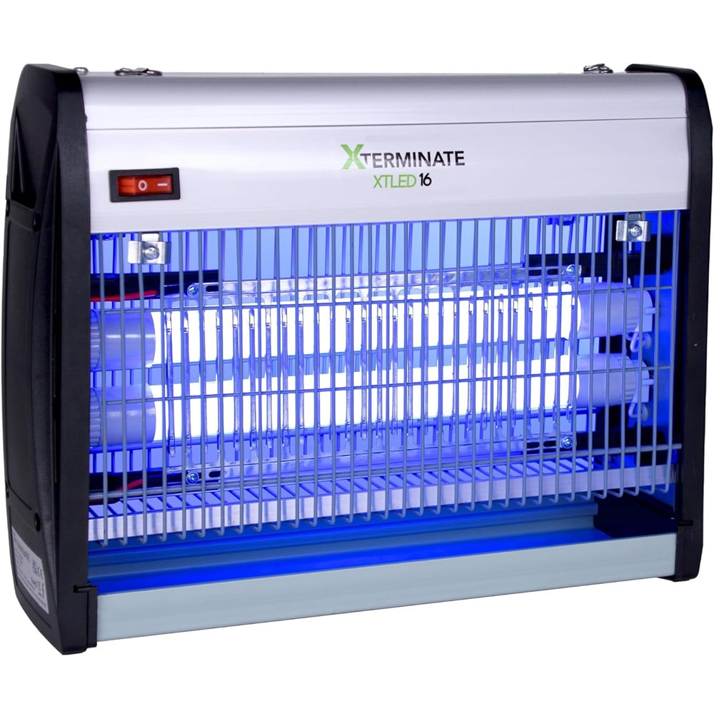 Keep your home or work space free from flies and other flying insects with this Xterminate LED fly killer. It’s designed to entice pesky flies to fly into the unit using the LED bulbs. Once they’ve flown into the unit, the fly killer zaps the insect to kill them instantly. This makes them a quick, easy and clean way to remove annoying insects from your space, particularly in the warmer months when flies can become a real nuisance. This fly zappers use LED bulbs, which offer around 1800V –2000V of zapping power. This is enough to kill all flying insects whilst still being super energy-efficient. LED bulbs have low emissions and can operate in cold conditions, making this fly zapper the perfect addition to your space. Each bulb has a life span of up to 8000 hours. This 16W fly zapper has a room coverage of up to 50m², each 30W fly zapper has a room coverage of up to 80m² & each 40W fly zapper has a room coverage of up to 100m². For ease, you can safely install this Xterminate fly killer to your wall or ceiling or have it free-standing – the choice is yours! Each fly zapper comes with a hanging chain, or if you prefer, you can also hang the unit to screws on the wall using the pre-cut keyhole design (fixings required). Easy to clean to keep this fly killer as hygienic as possible. Simply pull out the tray at the bottom of the fly killer and empty the dead flies before returning the tray back to the unit.