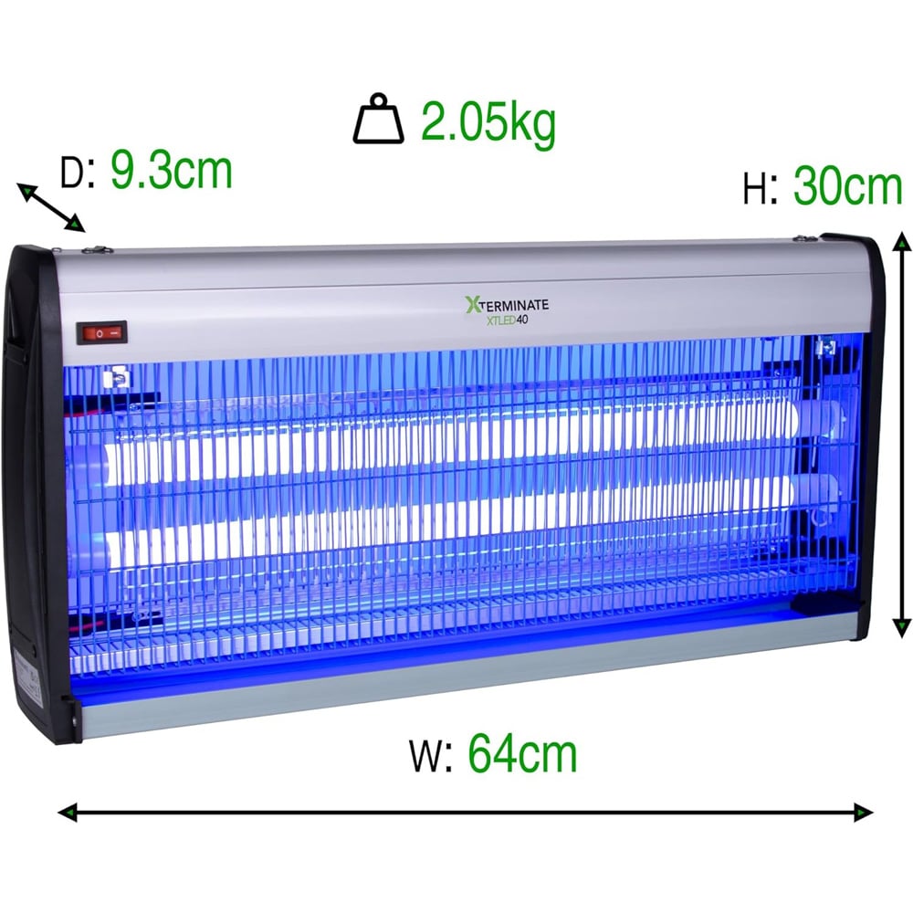 Keep your home or work space free from flies and other flying insects with this Xterminate LED fly killer. It’s designed to entice pesky flies to fly into the unit using the LED bulbs. Once they’ve flown into the unit, the fly killer zaps the insect to kill them instantly. This makes them a quick, easy and clean way to remove annoying insects from your space, particularly in the warmer months when flies can become a real nuisance. This fly zappers use LED bulbs, which offer around 1800V –2000V of zapping power. This is enough to kill all flying insects whilst still being super energy-efficient. LED bulbs have low emissions and can operate in cold conditions, making this fly zapper the perfect addition to your space. Each bulb has a life span of up to 8000 hours. This 16W fly zapper has a room coverage of up to 50m², each 30W fly zapper has a room coverage of up to 80m² & each 40W fly zapper has a room coverage of up to 100m². For ease, you can safely install this Xterminate fly killer to your wall or ceiling or have it free-standing – the choice is yours! Each fly zapper comes with a hanging chain, or if you prefer, you can also hang the unit to screws on the wall using the pre-cut keyhole design (fixings required). Easy to clean to keep this fly killer as hygienic as possible. Simply pull out the tray at the bottom of the fly killer and empty the dead flies before returning the tray back to the unit.