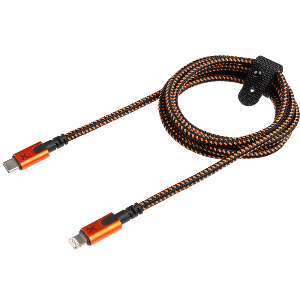 Elevate your device charging's with the Xtorm Xtreme Black and Orange USB-C to Lightning Cable 1.5m. This ultra-strong cable is built to last, withstanding 100,000 bends and pull-tested to support up to 100kg. It is made from a multi-layer composite material with a reinforced core that gives it extra strength and durability. The cable is designed to be rugged, including the included cable strap. The reinforced materials used are 33% aluminium, 54% Nylon Braiding and 13% DuPont™ Kevlar® Fiber. It features the XFLEX bend-proof technology. It combines a specially designed connector with a braided nylon cable and reinforced core, making the cable flexible and extremely strong.
