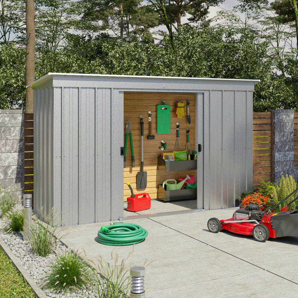 Store your outdoor equipment safely with the Yardmaster Store All 10 x 4ft Pent Roof Metal Storage Shed. This shed provides a durable and weather resistant storage solution for securely storing items such as bicycles and garden tools. This storage shed that is made using 100% hot dipped galvanised steel is totally fire safe and maintenance free storage shed. It comes with a ten year anti-rust warranty. Anchor fixings included.