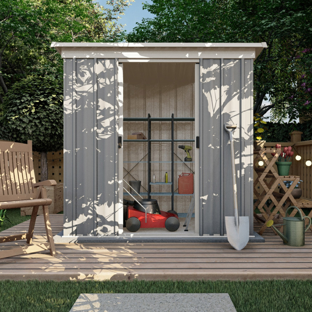 Experience the durability and security of the Yardmaster 6 x 4ft Platinum Pent Metal Storage Shed, expertly crafted in the UK from 100% hot-dipped galvanised steel. This extra-tall shed offers a robust, weather-resistant haven for your bicycles, garden tools, and more, ensuring they stay safe and dry. With its fire-safe build and a 15-year anti-rust warranty, you can enjoy a completely maintenance-free storage solution that stands the test of time.