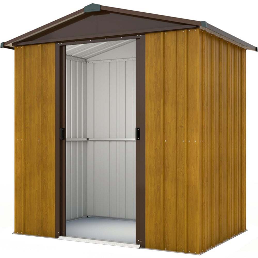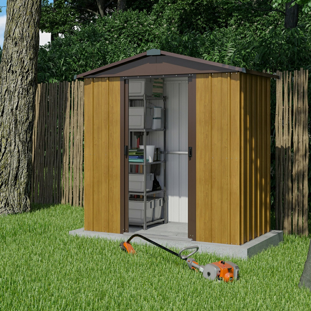 Experience the charm of wood with the durability of metal in the Yardmaster 6'8 x 4'6 Woodview Apex Metal Storage Shed. Perfectly blending style and functionality, this shed features attractive wood effect wall cladding, giving it the appearance of a wooden shed without the need for annual treatments. Ideal for storing garden equipment or household items like bicycles, it's crafted in the UK from durable hot-dipped galvanised steel, ensuring no maintenance is ever required. The pad-lockable double sliding doors include a weather seal to keep out rain and snow, providing a secure and dry space for your belongings.