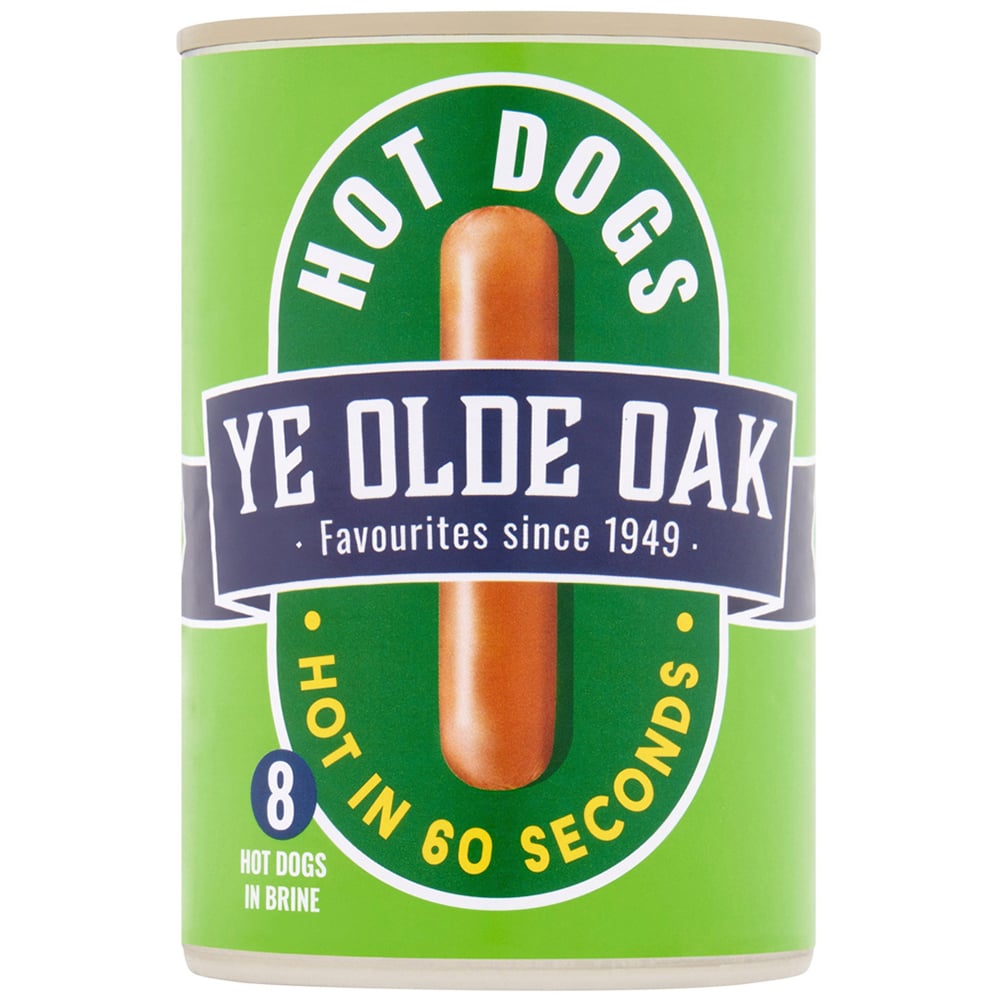 The Original And The Best Our Delicious Hot Dogs Have Been The Nation's Favourite Since 1949. Pre-Cooked And Great Eaten Hot Or Cold Straight From The Can.. Favourites Since 1949. Hot In 60 Seconds. Ye Olde Oak.