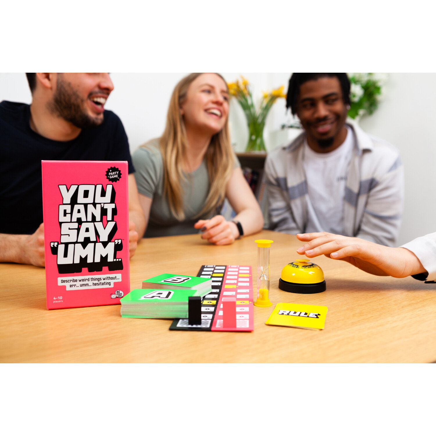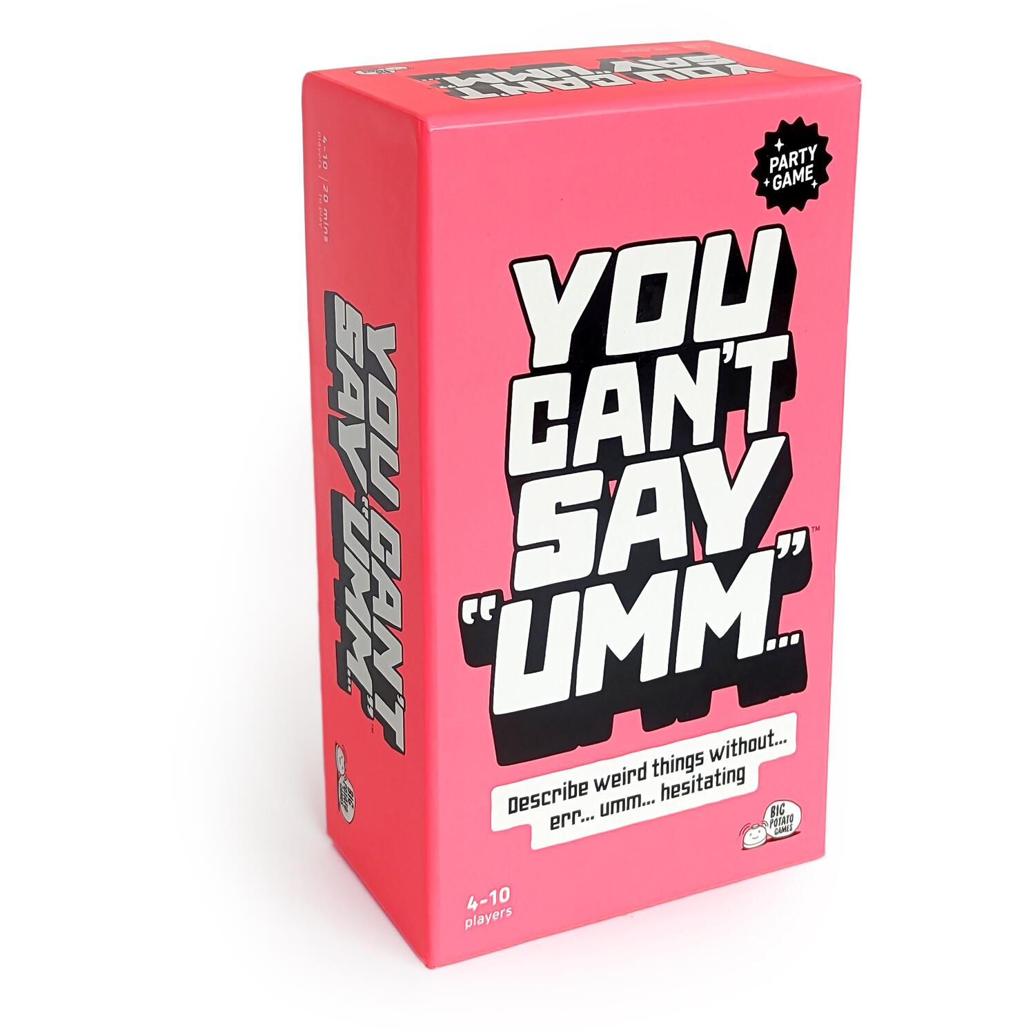 Make the party time more exciting with this You Can't Say Umm Game. Two teams race to get their pieces to the end of the board first. They'll do it by describing as many strange-sounding objects as they can, from the random cards they pick up. The only difficulty is you can't say umm. Each time you do, the bell will sound, adding to the pressure! As each team gets closer to the end, more and more sounds become off-limit, making it a frantic dash to the finish line. A fun way to spend the holiday time with family and friends.