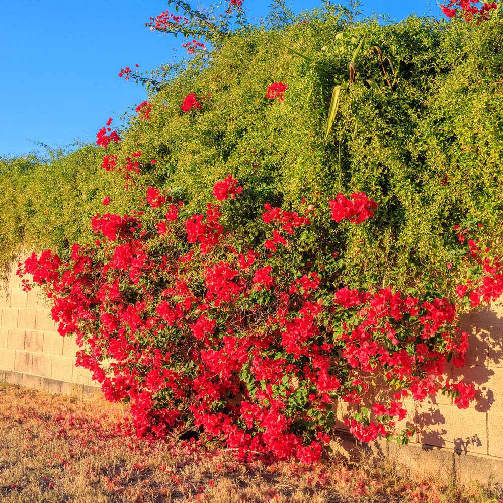 Add instant wow-factor to your garden with this trained red Bougainvillea - a truly striking plant that brings a burst of exotic colour to patios, balconies and sunny corners. Fully established and trained against a trellis, this living sculpture offers both structure and vivid seasonal display. Rich crimson-red bracts are the main event - vibrant, paper-like and full of impact, they provide months of dazzling colour during the warmer months. Each bract surrounds a small, creamy white flower, but it’s the glowing red tones that steal the show. When placed in full sun, the colour intensity is absolutely stunning. Best grown in a decorative planter to transform patios, entrances or garden walls across summer, before being brought inside for protection from autumn, such as into a conservatory or greenhouse. With the right care, your Bougainvillea will flourish for years, creating bold seasonal impact with very little maintenance. Supplied as an established plant in a 17cm pot, trained against a trellis, ready to plant and display.