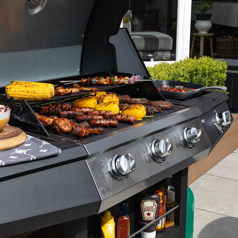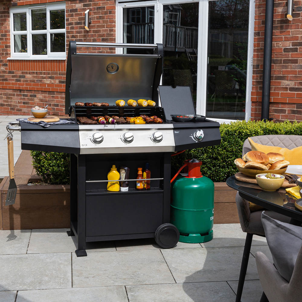 This 3 burner Zanussi Gas BBQ is the ultimate outdoor accessory for family get-togethers or summer garden parties. Designed to look good in any contemporary setting, this BBQ is the perfect addition to your outdoor entertaining space. The ZGBBQ3B01-C features automatic push-button ignition for easy lighting, so you can get grilling without any fuss. This model also comes complete with a handy side burner, perfect for preparing sides, it means you can make everything for your outdoor feast at once, without having to run back indoors. There’s also a practical built-in shelf with accessory rings, so you can store your cooking utensils within easy reach, and a condiment shelf for all your BBQ sauces and spices. The large cooking area (63.5 x 40.6cm) is perfect for cooking plenty of portions, whilst the hinged lid is ideal for protecting your BBQ and helping your food cook quickly. The cast iron grill is designed to absorb and distribute heat perfectly for even cooking, meaning you can benefit from faster cooking times, easier cleaning and a longer grill life. There’s even an integrated temperature gauge to help you maintain optimum cooking temperature, meaning those burgers and sausages will always be cooked to perfection. Plus, this model also features integrated wheels for manoeuvrability, so you can easily move it around. It comes with a UK hose and regulator and a perfect-fit cover for those who want to keep their BBQ outside during the summer months.