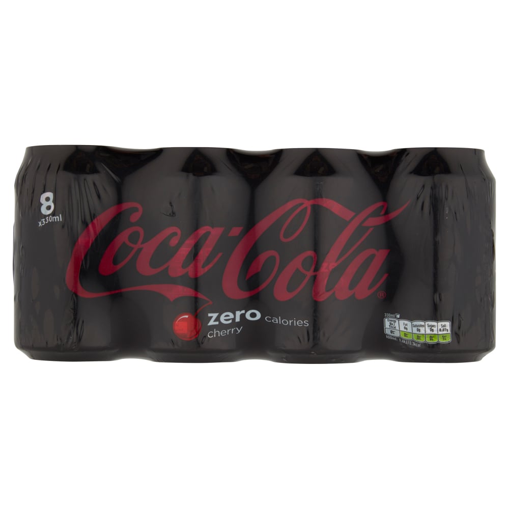Coca-Cola Zero Sugar Cherry 8 x 330ml. Coca‑Cola Zero Sugar, with a smooth cherry flavour. Cherry coke. Looks and tastes like Coca‑Cola original taste, but without the sugar and with a cherry flavour. Soft drink. Zero sugar. Zero calories. Coke without sugar. Delicious and refreshing. Carbonated beverage. Great taste. Suitable for Vegans. Suitable for Vegetarians.