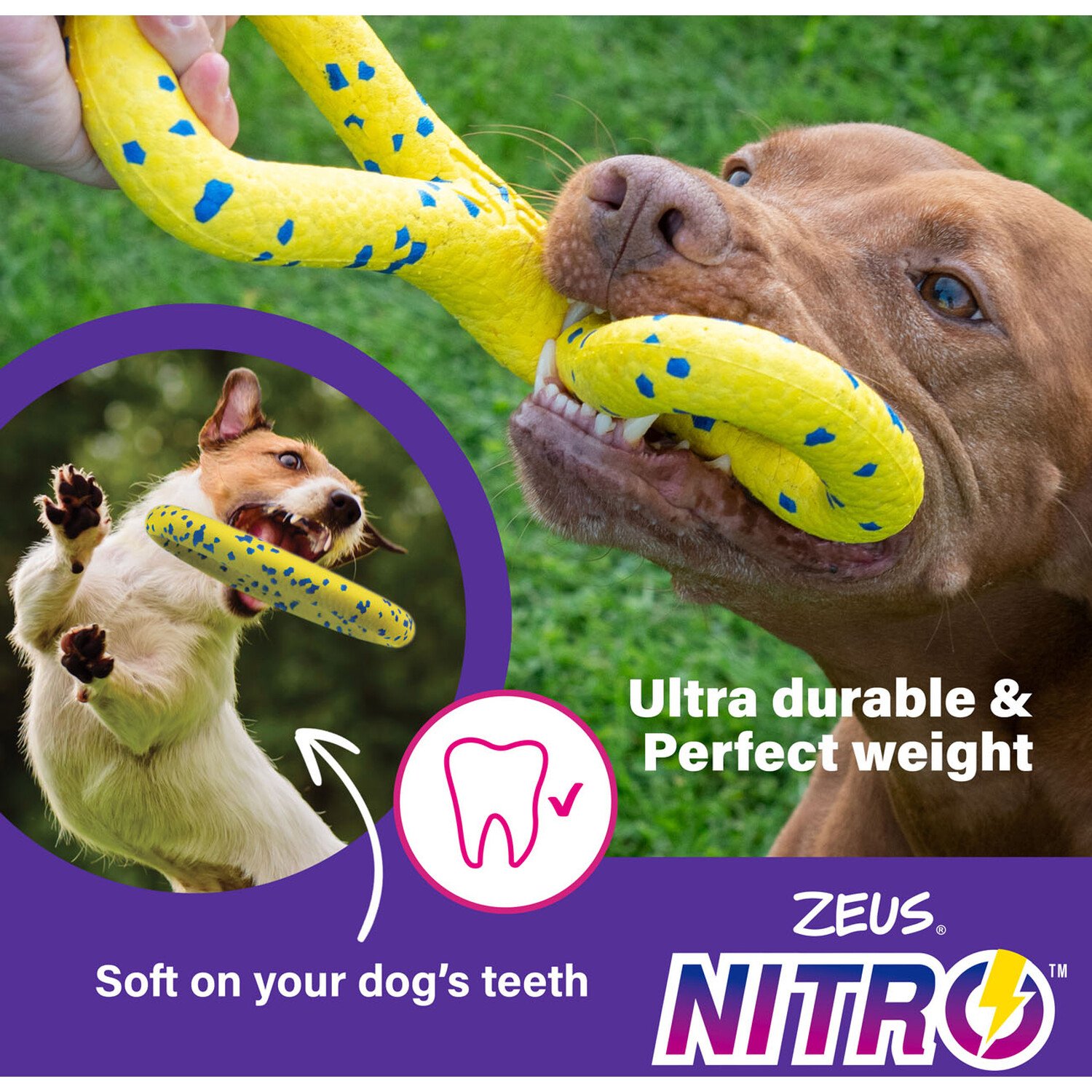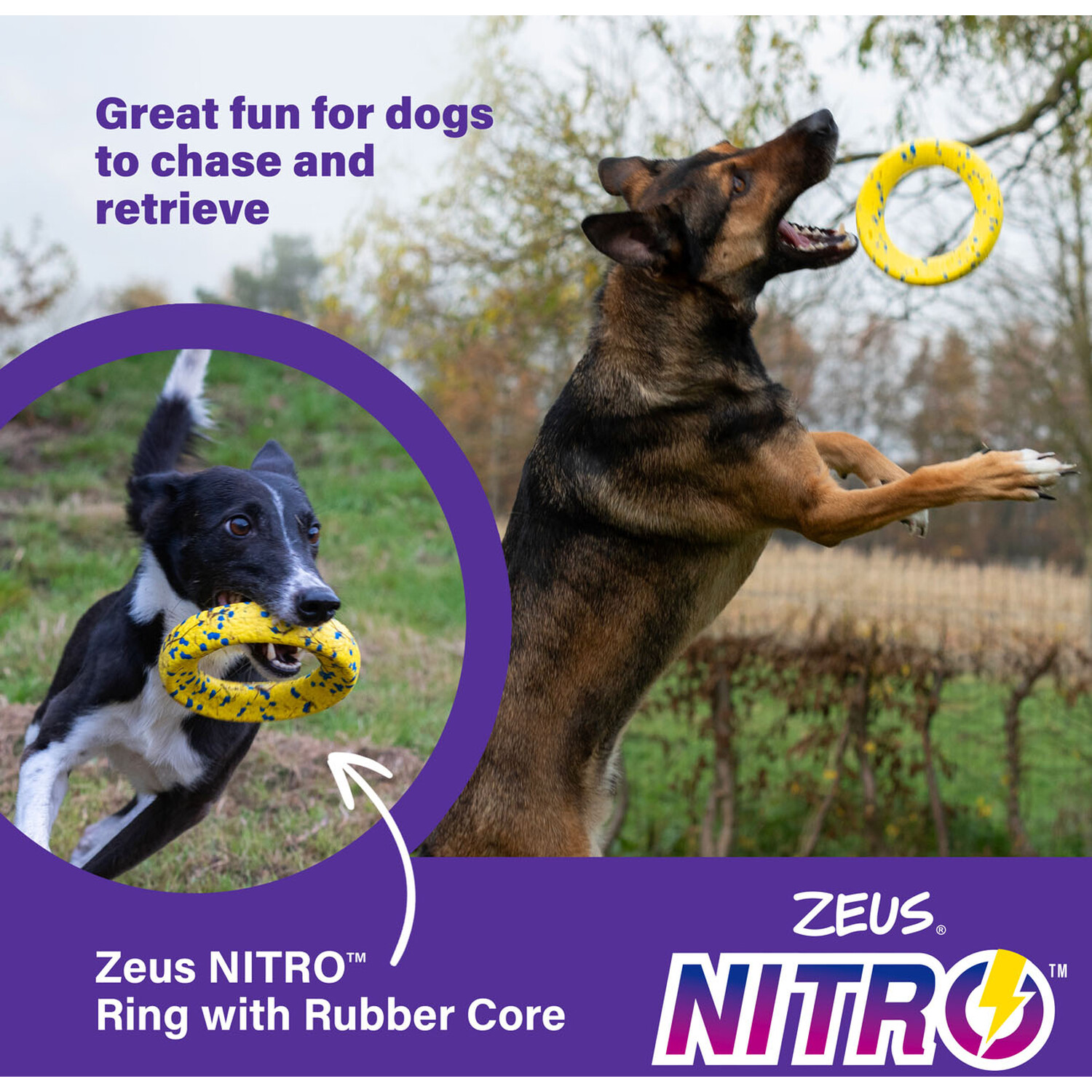 Enjoy endless fun with the Zeus Nitro Weighted Ring Dog Toy. Its large surface area ensures a firm, secure grip while still being gentle on your dog's teeth. Tough, safe, and easy to clean, it is ideal for long-distance play and outdoor adventures. Whether you're at the park, in the backyard, or inside your home, this toy promises to provide unlimited fun and keep your pet entertained for hours.