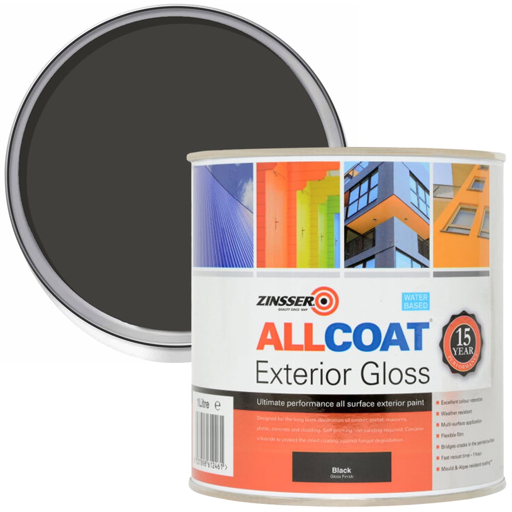 Protect all exterior surfaces including wood, metal, masonry, plastic, concrete and cladding with Zinsser Allcoat Black Water-Based Exterior Gloss Paint. This versatile, water-based paint lets moisture escape, can be recoated in just an hour and creates a barrier that sheds water. It resists cracking, blistering, flaking, rain, and severe weather, with a biocide to prevent fungal degradation. Pack size: 1L.