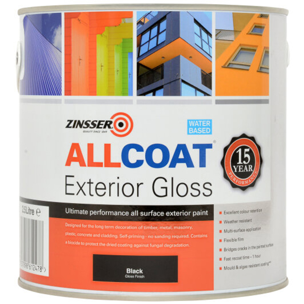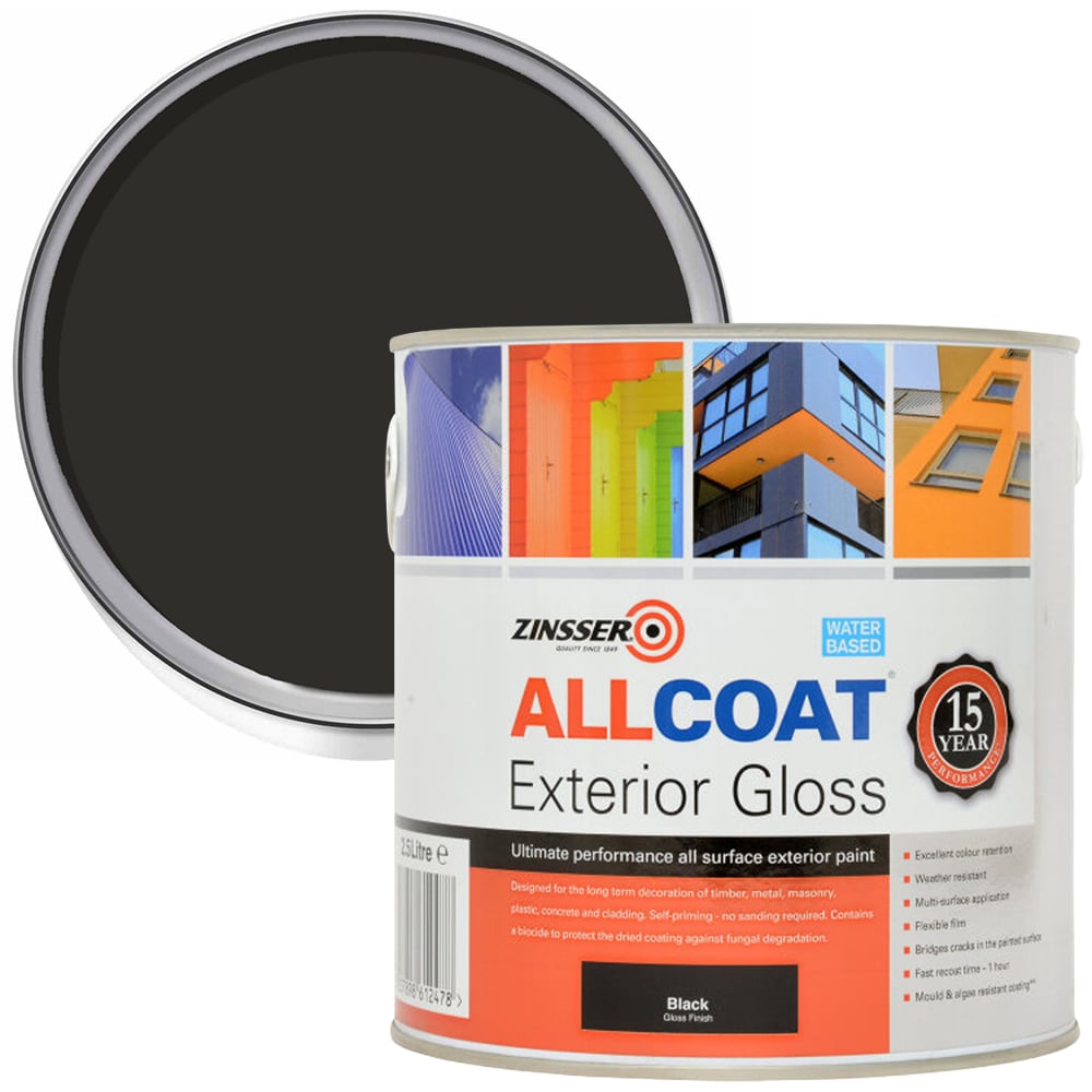 Protect all exterior surfaces including wood, metal, masonry, plastic, concrete and cladding with Zinsser Allcoat Black Water-Based Exterior Gloss Paint. This versatile, water-based paint lets moisture escape, can be recoated in just an hour and creates a barrier that sheds water. It resists cracking, blistering, flaking, rain, and severe weather, with a biocide to prevent fungal degradation. Pack size: 2.5L.