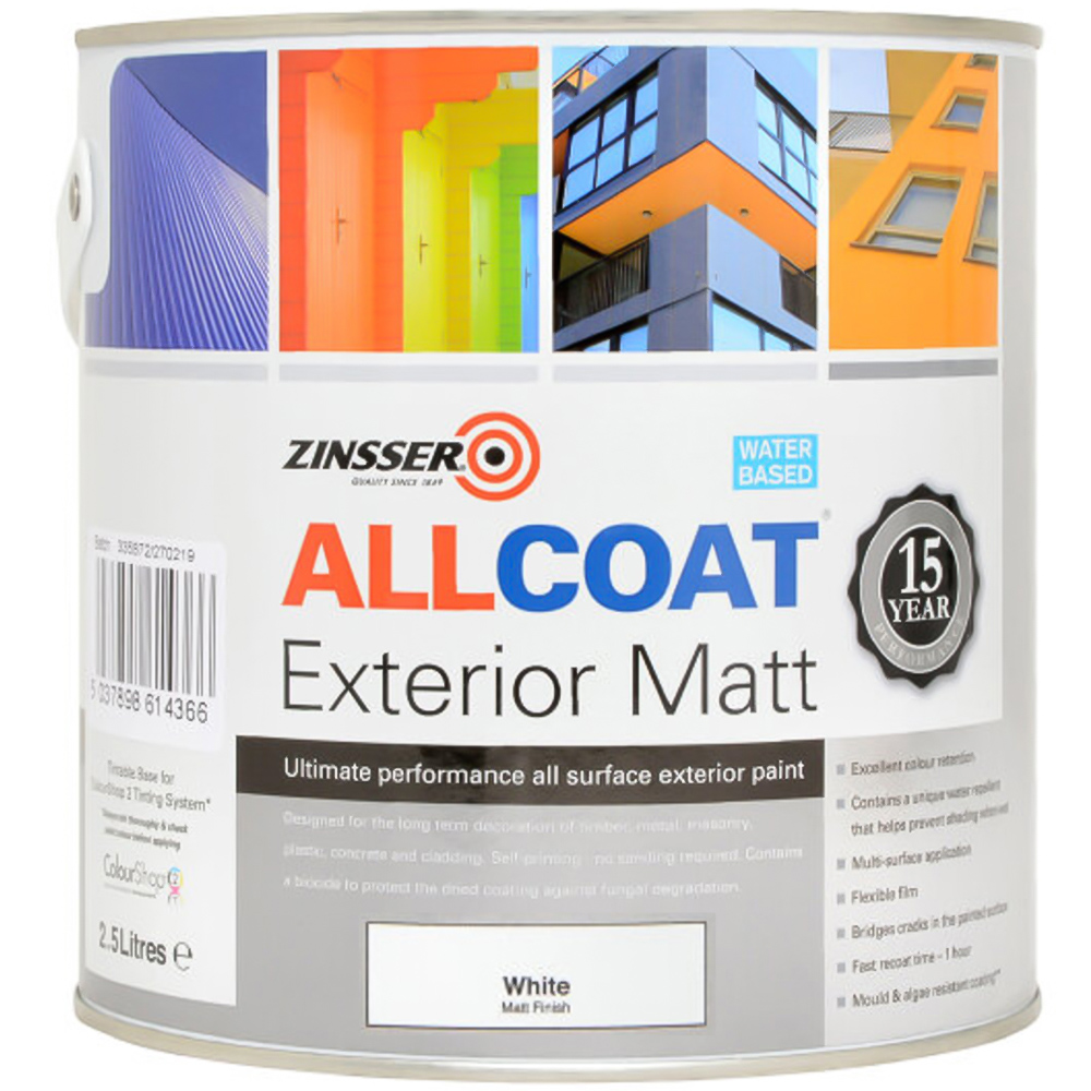 Ensure long-lasting protection for all surfaces including timber, metal, masonry and more with Zinsser Allcoat White Water Based Exterior Matt Paint. This water-based option lets moisture escape, can be recoated in just an hour, and creates a barrier that sheds water. It stands up to cracking, blistering, flaking, rain, and tough weather, plus it has a biocide to stop fungal growth. The matt finish bridges gaps up to 0.5mm and maintains colour even when wet. Pack size: 2.5L.