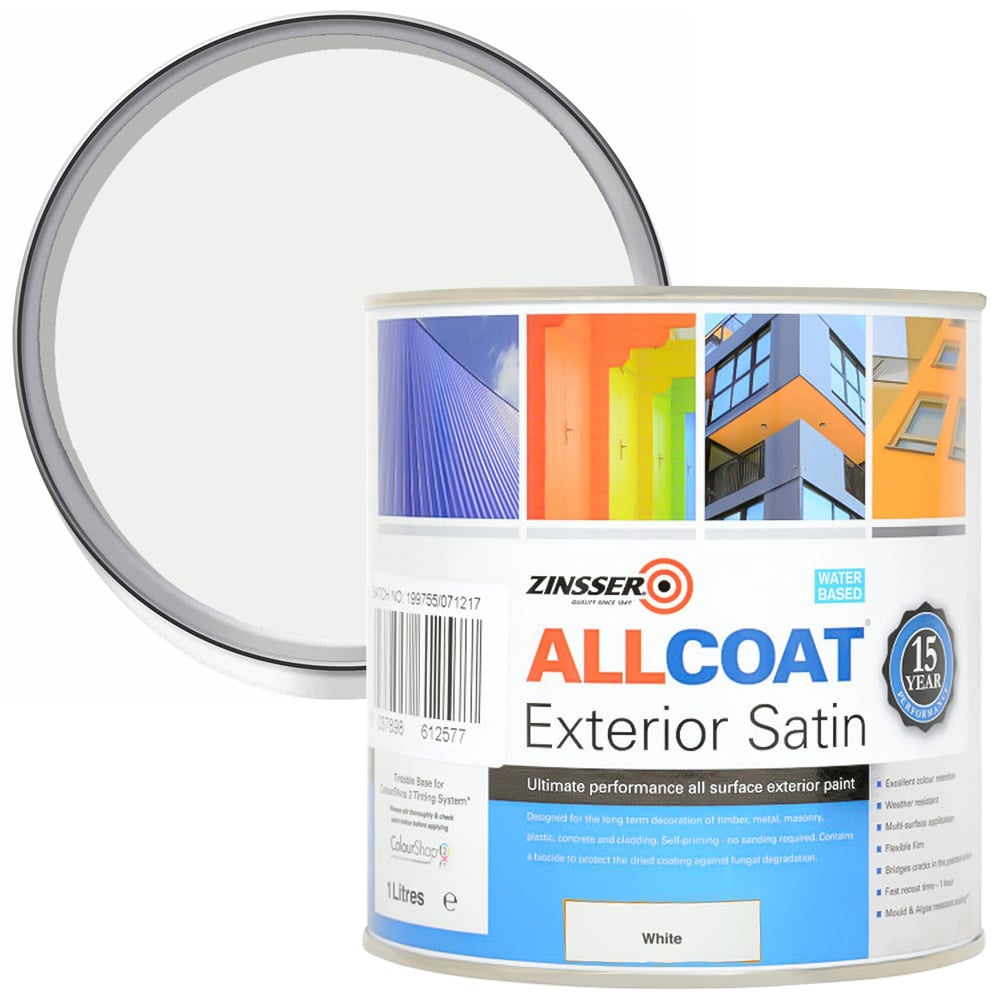 Transform your space in no time with the Zinsser Allcoat White Water Based Exterior Satin Paint. This paint is perfect for all kinds of surfaces like wood, metal, masonry, plastic, concrete, and cladding. It's water-based, allowing for vapor permeability, and you can recoat it in just an hour. It resists cracking, blistering, flaking, rain, and severe weather, with a biocide to prevent fungal degradation. The satin finish ensures a bright, beautiful, long-lasting look for your property. Pack size: 1L.