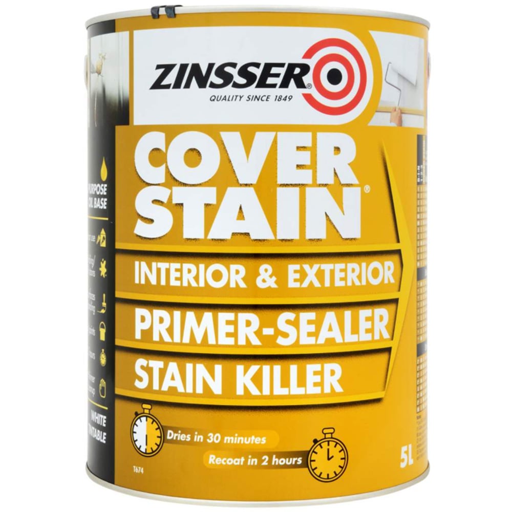 Create a perfect base for paint with the Zinsser White Cover Stain Primer and Sealer. This super-fast-drying primer, sealer, and stain blocker is ideal for both inside and outside projects. It dries for recoating in just two hours, making it ideal for quick projects. When used indoors, it excels at killing tough stains like nicotine and water while providing a solid base for your enamel. Its quick-drying nature and strong hiding ability guarantee a smooth finish for your top coats. For outdoor use, it penetrates deeply and remains flexible, outshining many oil-based primers, especially on tricky wood panelling and trim. Pack size: 5L.