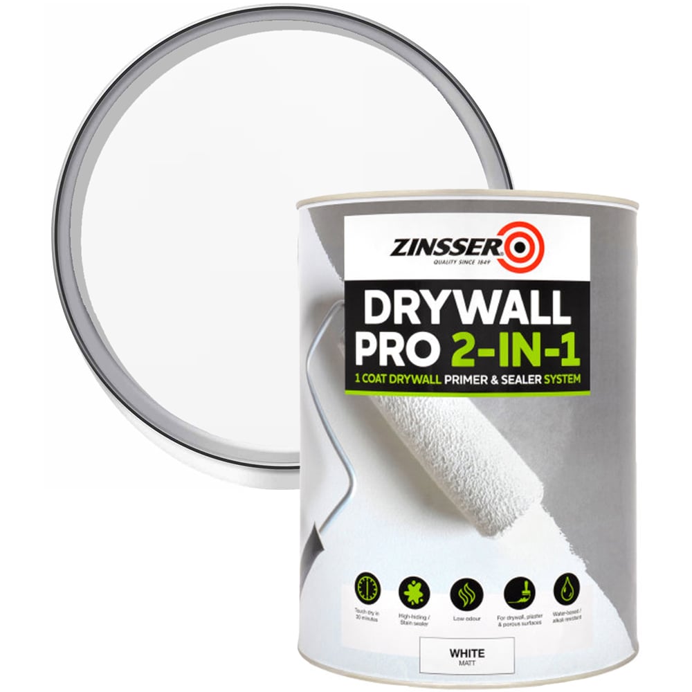 Prepare drywall surfaces for any project with the Zinsser Drywall Pro 2 In 1 White Matt Primer and Sealer. This unique priming and sealing system addresses common drywall issues, creating a sound, water-resistant foundation for painting, wallpapering, texturing, and more. It seeps into and seals up porous, moisture-prone surfaces like damaged drywall, new drywall, filler, joint compound skim coats, plaster, wallpaper glue residue, and chalky builder’s flat paint, ensuring a smooth, even finish while keeping future issues at bay. Pack size: 5L.