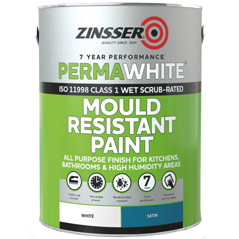 Get exceptional durability and mould resistance for high-moisture areas with the Zinsser Permawhite Satin White Interior Paint 5L. Designed to withstand persistent humidity, frequent temperature changes, and poor air circulation, this tough, scrubbable paint provides reliable protection. Its durable paint film resists cracking, peeling, and blistering for up to seven years, binding seamlessly to existing solvent-based or glossy paints. It is also perfect for sealing flat paint, new drywall, cement blocks, and concrete. Its mould-resistant formula ensures a long-lasting, beautiful finish.